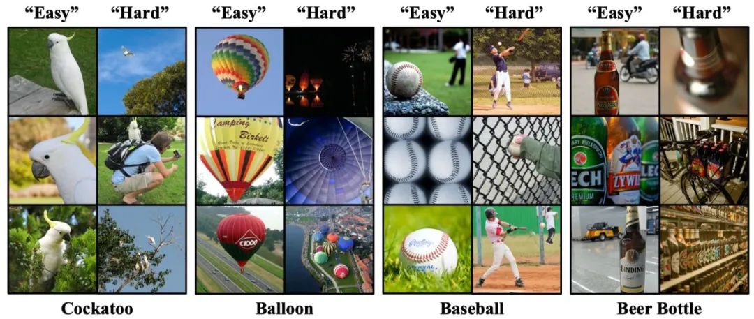 那么,什么样的样本适合更少的 token,什么样的样本适合更多的 token 呢?下图给出了可视化的结果,“easy”和“hard”分别代表需要少和多的 token 数目。可见,后者往往包含复杂的场景、较小的物体尺寸、以及一些非常规的姿态和角度。