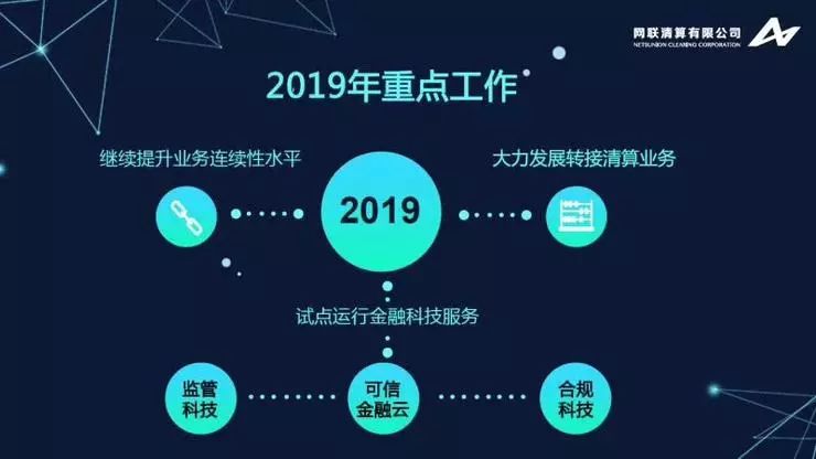 据强群力透露,2019年网联主要有三大工作重点,包括:1、继续提升业务连续性水平;2、大力发展转接清算业务;3、试点运行金融科技服务。