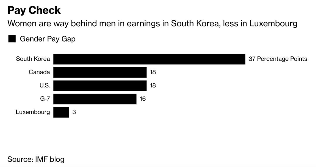 考虑到工作时间、工种、受教育程度、年龄和工作经验,韩国的男女薪资差距为37%。美国和加拿大的性别工资差在18%左右,而七国集团(G7)的平均差距为16%。