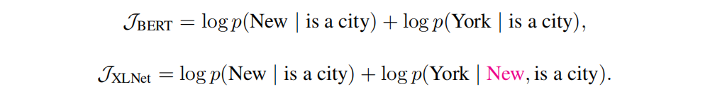 通过自动编码的架构,意味着我们在输出中有一个序列,在输入确定的序列中添加一些噪声,通过mask,因此当你想要预测这些mask的时候,你有左边的输入标记和在右边有什么限制。当你预测令牌之一的输入,右边也是mask的token,所以你是失去了部分信息,这是有限的,第二个问题是有两个连续的masked token像 new york,new york 是有内部依赖的,你想预测new york的结果非常好,重要的是要知道new是第一个令牌,new york与york new可能是两个城市。这与他们的位置关系存在严格的限制。
