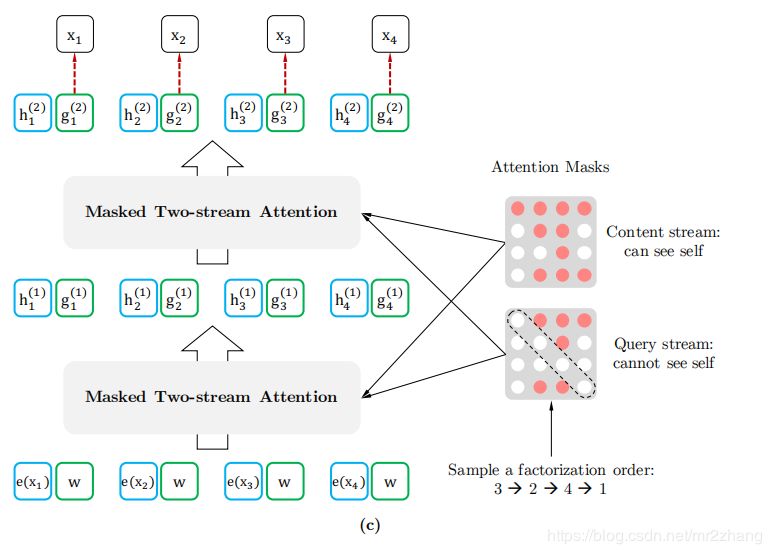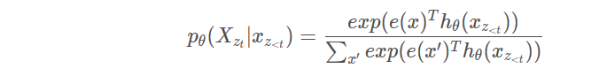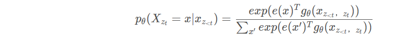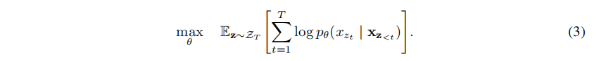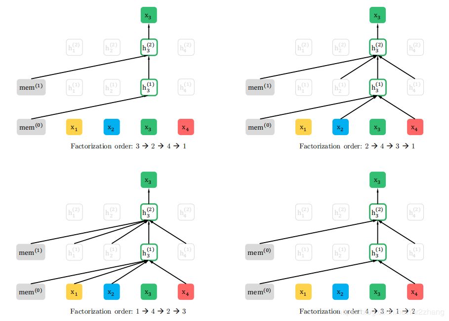 我们有4个因子就有24中排列,因此分解它很疯狂,对样本进行抽样,随机抽样,可能性是上图的公式,Zt是一切可能,这里表示24(4!)种分解,z是其中之一,本质上,对于文本序列X,我们一次采样一个分解顺序z,