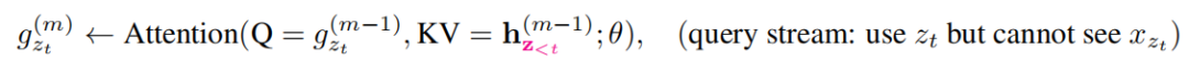 查询表示 g_θ(x_{z<t},z_t) ,简称g_zt,只访问上下文信息x_{z<t} 和位置z_t,而不访问内容x_zt,本位置的context embedding不参与计算,如上所述。公式如下: