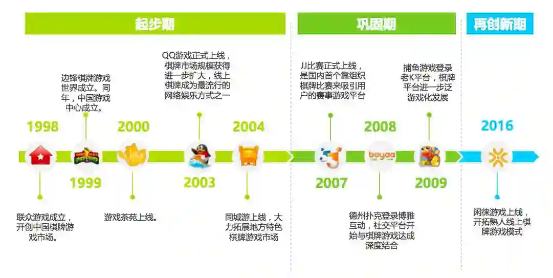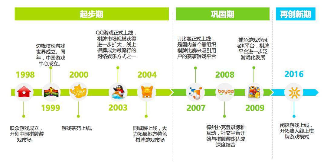 棋牌游戏最初是在线下发展的,直至1998年联众游戏上线,中国线上棋牌游戏市场正式启动,开启PC棋牌游戏时代。从PC时代到现在,不同的棋牌游戏平台不断推陈出新,给棋牌游戏市场不断注入新鲜活力。
