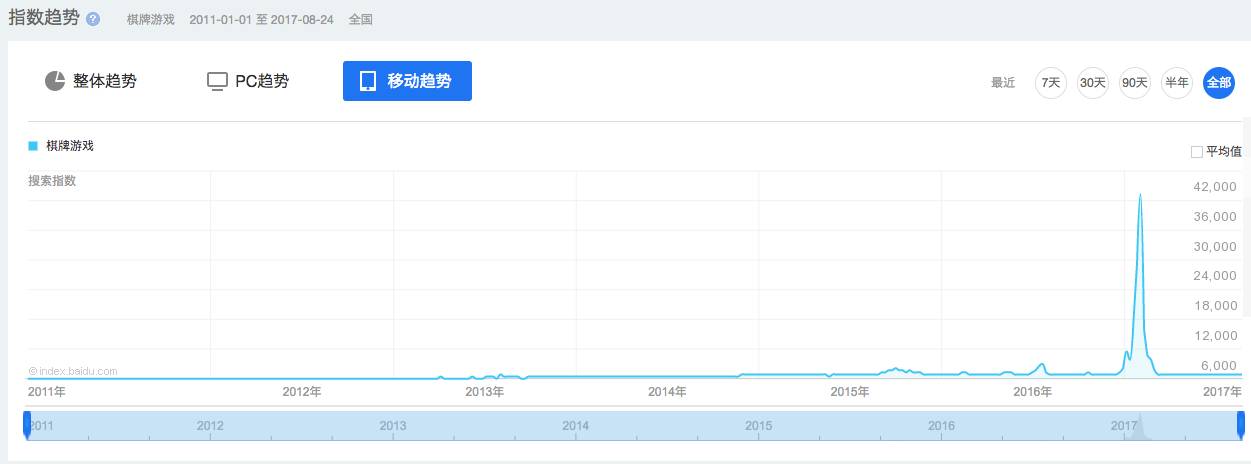 2007年移动端棋牌游戏开始发展,iPhone普及,德州扑克等棋牌游戏较早进入移动端发展。近几年尤其是2014年到2016年,开始迈入移动棋牌游戏时代,移动端整体营收与用户规模增长迅猛。2016年在闲徕等新兴平台推动下,棋牌游戏行业迎来新的突破。