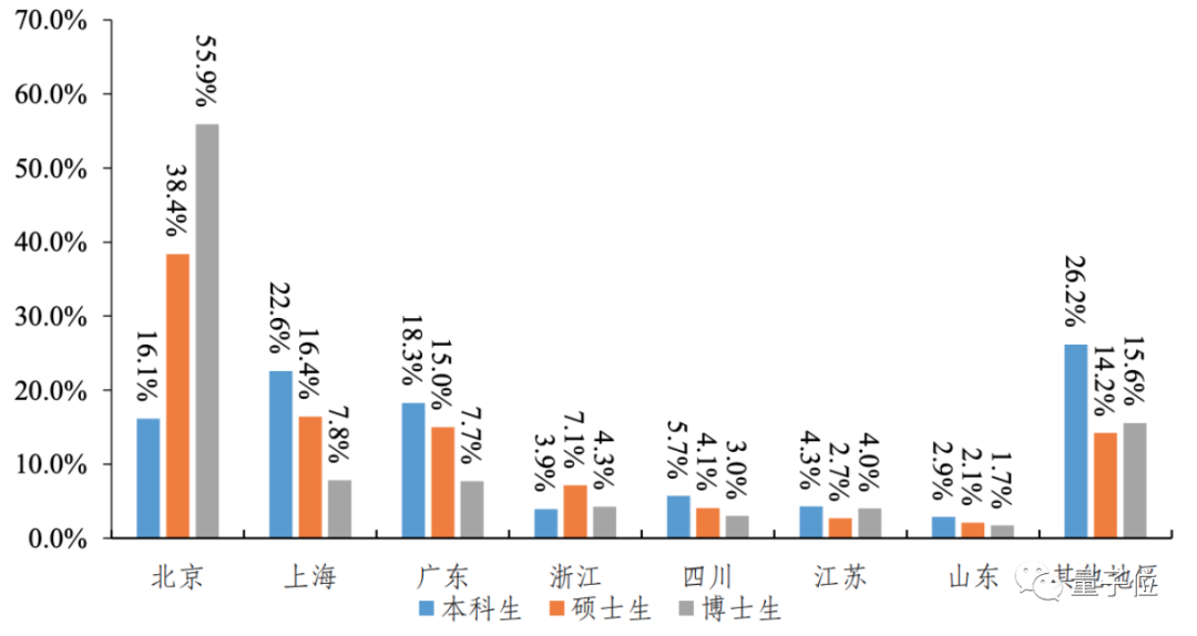 比如在地域上,今年清华本科生留京的比例仅达到16.1%,更多人选择了广东或上海;相比之下,北大本科生更愿意留在北京,比例达42.33%。