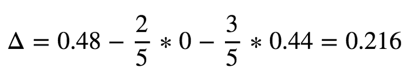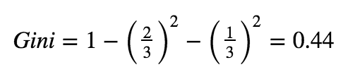 出于这个原因,当子集中只有一个类时,基尼系数会为0.因为确实找到一类的可能性是1.在这个例子中,我们给定我们已经到达了叶节点,在这里不需要再进行分支操作了,我们已经达到了目的.但是如果我们看上面的图,当处于根节点之后的False情况下,我们有一个包含三个观测值的子集,两个是猫一个是狗,如果我们想计算这个子集的基尼系数,我们可以: