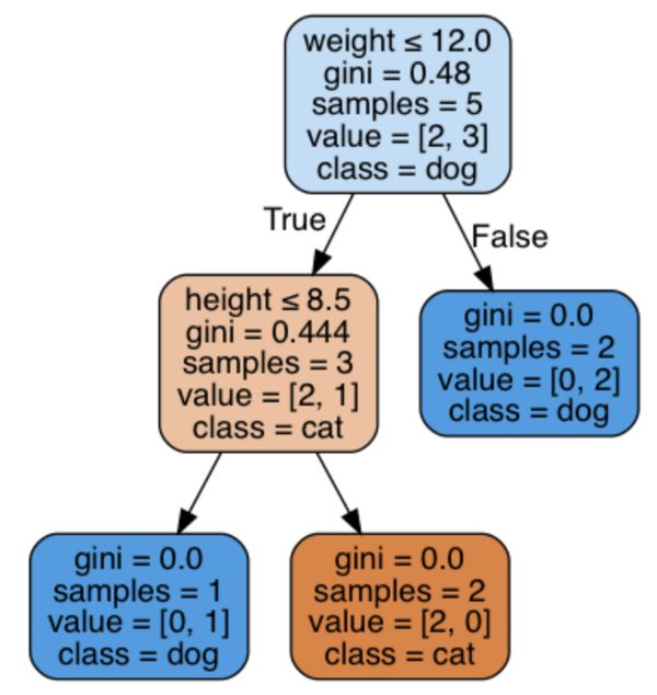 很牛逼,对吧~ 尽管在我们的‘手稿’中,我选择了‘15磅重量’作为我的根节点,算法依据同一个变量判断分支,但是对于12这个值则创建了一个只有一条狗的叶节点(对于已有的元素重量大于12磅时,事实上基尼系数为0)。根节点后为真的情况下生成了子集,并且进一步依靠重量变量8.5磅为判断依据进行分支。最后一个分支生成了无基尼系数的两个纯子集。