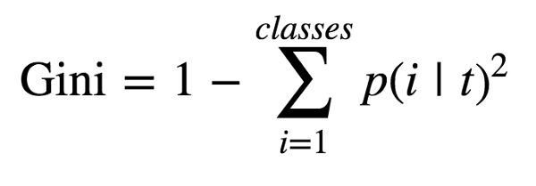 为了计算基尼系数,我们考虑在每一个节点后找到每一类的可能性,对这些值进行求平方之后,用1减去这个值。