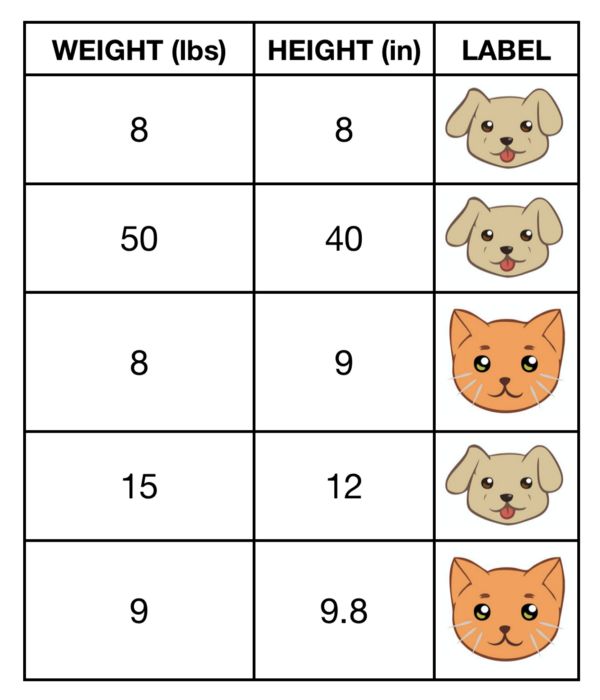 让我们来建立一个决策树:基于高度和重量来决定一个宠物是猫还是狗。