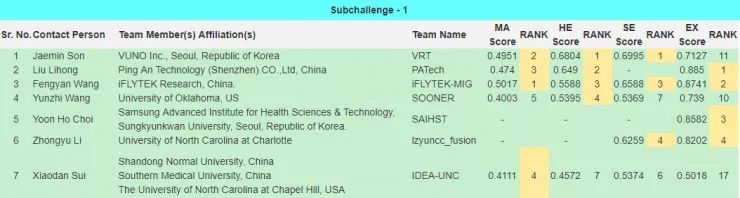 平安科技“PATech”团队在MA上得分排名第三,HE得分第二,EX得分第一。