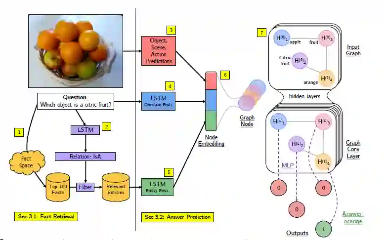 语义图包含了用于衔接视觉和知识的高层语义信息,构造原理是先使用Densecap预训练模型生成图像的细粒度caption(这既包括单个object的属性,也包括不同object的关系),然后使用Spice算法根据排名靠前的caption构造一个语义联系图。节点代表object的名字或属性,边代表关系。最后用GloVe embeddings来表示节点和关系。