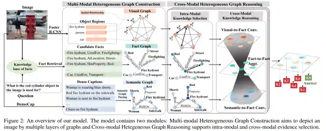 文章的出发点是将图像表示成一个多模态的异构图,其中包含来自不同模态三个层次的信息(分别是视觉图、语义图和事实图),来互相补充和增强VQA任务的信息。
