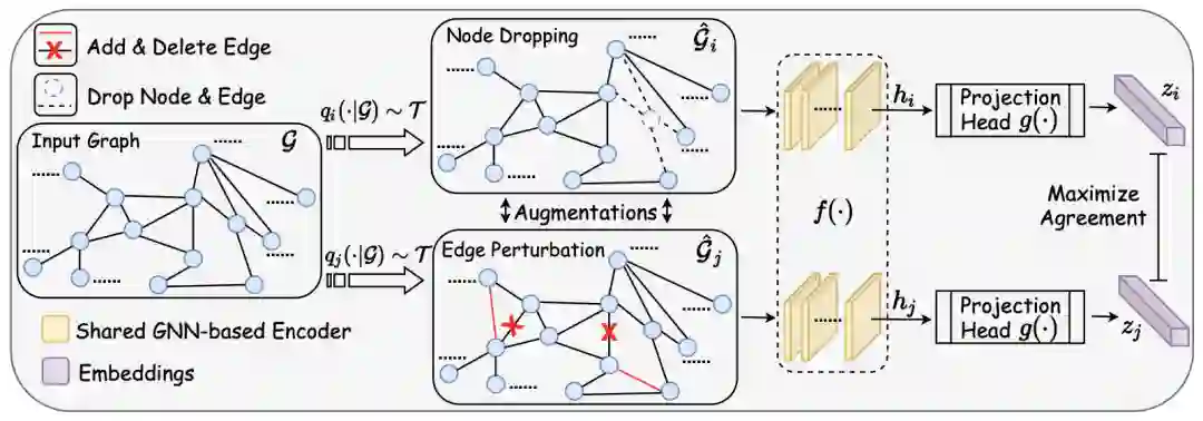 对每一个图进行两次随机的数据增强(如删除若干条边(edge)),增强后两个新图称为视图(View);