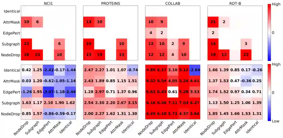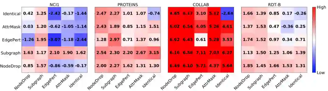 在 GraphCL 的实验中,作者表明不同领域的数据集所需要的数据增强方式是不同的。比如对于化学分子,随机删边可能会显著影响分子的性质,并不是一个好的数据增强方式。那么对于一批新数据,我们应该如何选择合适的图数据增强方式呢?