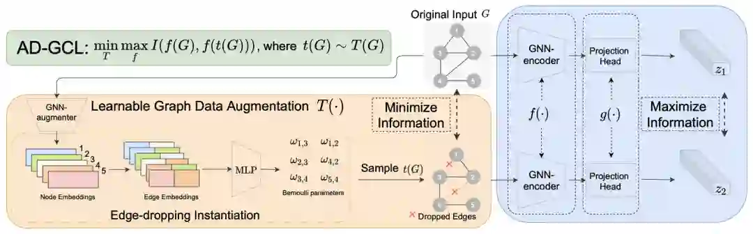 还有一些工作旨在探索,如何自动学习数据增强时对图做扰动的分布。在 NeurIPS 2021 的论文 Adversarial Graph Augmentation to Improve Graph Contrastive Learning 中,作者从数据增强如何保留图的信息出发,假设增强出的两个 View 之间并不是互信息越大越好,因为这些互信息中可能包含大量噪音。