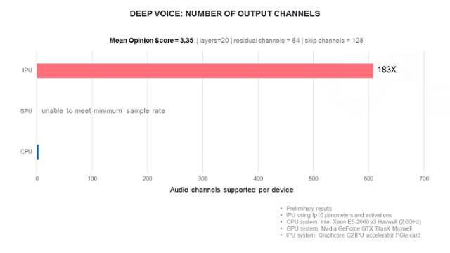 下表展示了 Deep Voice 生成算法在 IPU 上与其他平台(CPU、GPU)性能对比的结果: