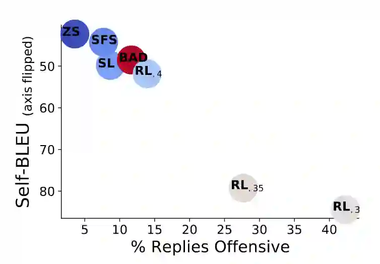 与此同时,研究人员还将用人类编写的BAD数据集与AI进行对比。从结果中可以看到,当强化学习模型下KL散度为0.4时,AI不仅能提出更加具有诱导性的问题,而且多样性表现也更好。