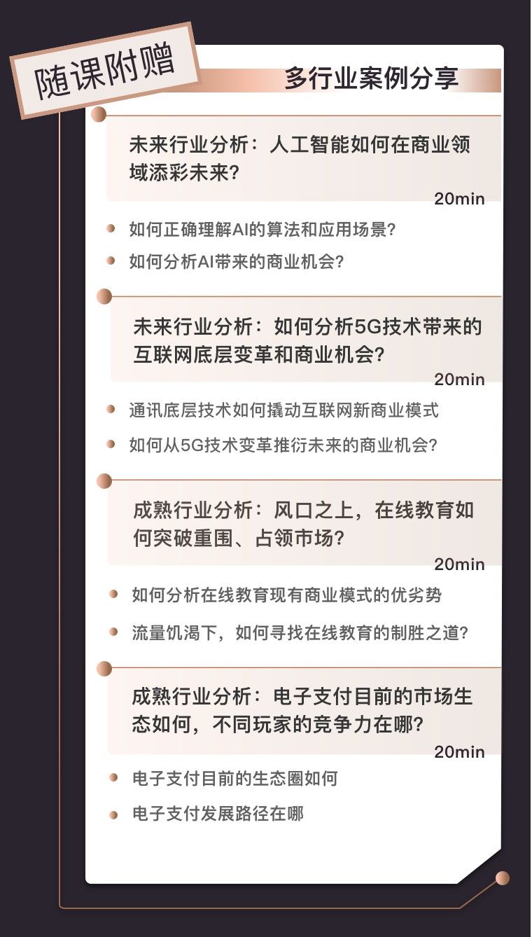 三位前麦肯锡人领衔授课,还有来自腾讯的商业分析师重磅加盟,无保留为你分享业内高水平商业分析工作过程。