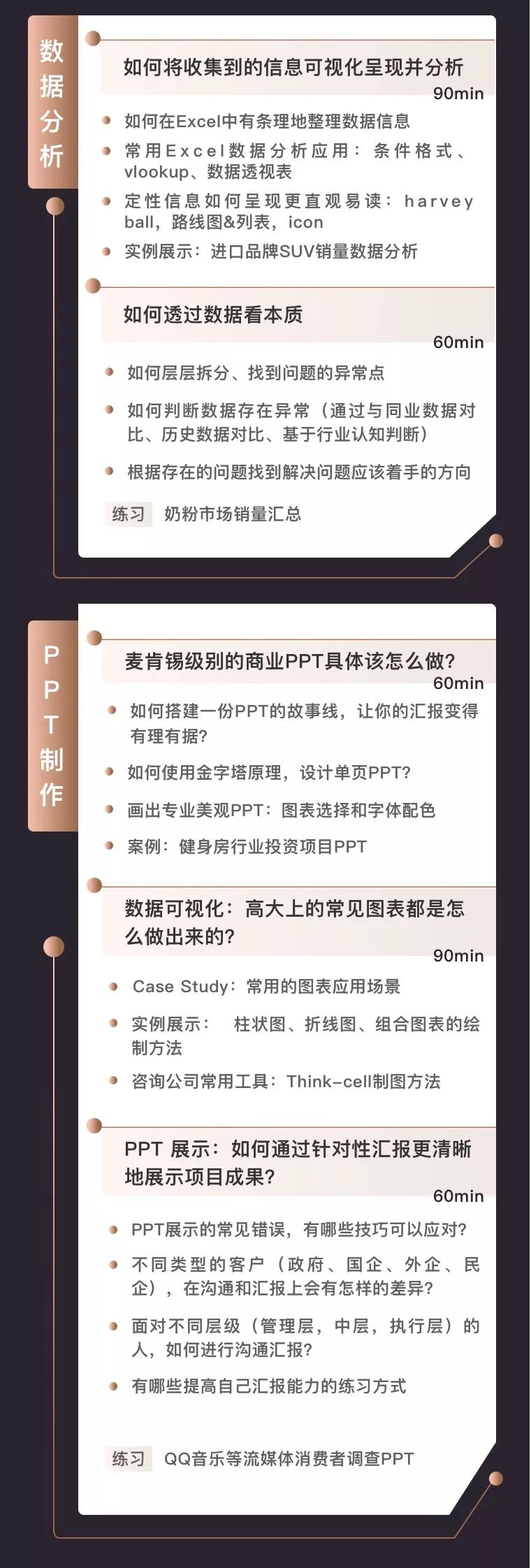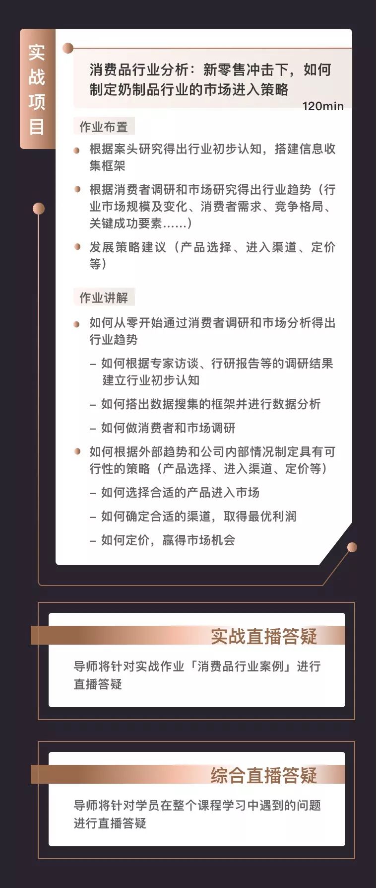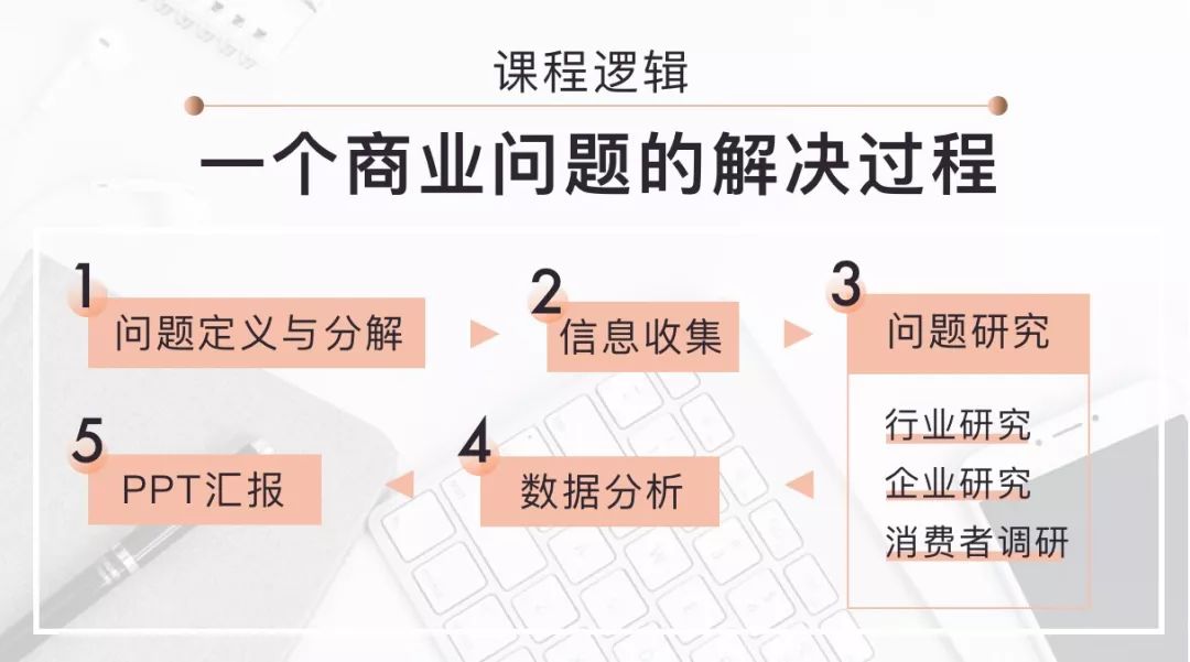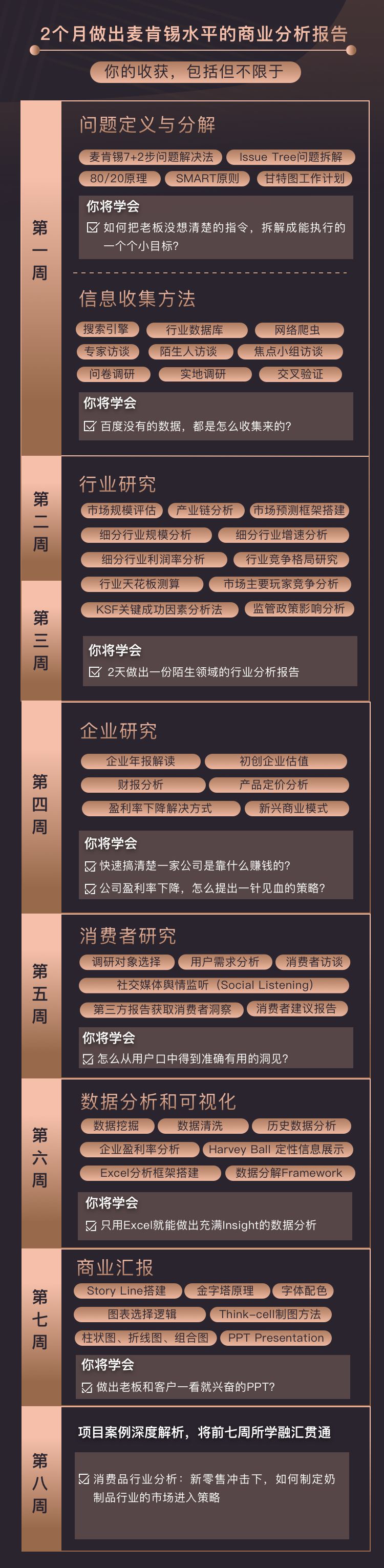 课程设计逻辑是「一个商业问题的界定-分析-汇报」,完整涵盖顶级商业分析师的工作流程,既有数据搜集、行业研究、企业研究、消费者研究,也有Excel数据分析,PPT制作。