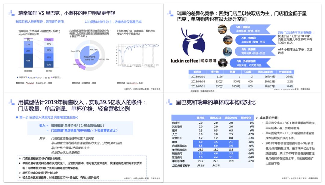 但真正厉害的人,不仅能用数据清晰展示瑞幸的差异化竞争策略,还会将它的收入预测指标进行拆解,通过门店数量、单店销量和实际单杯价格和轻食百分比推算收入,来告诉老板瑞幸烧钱到底是不是靠谱。