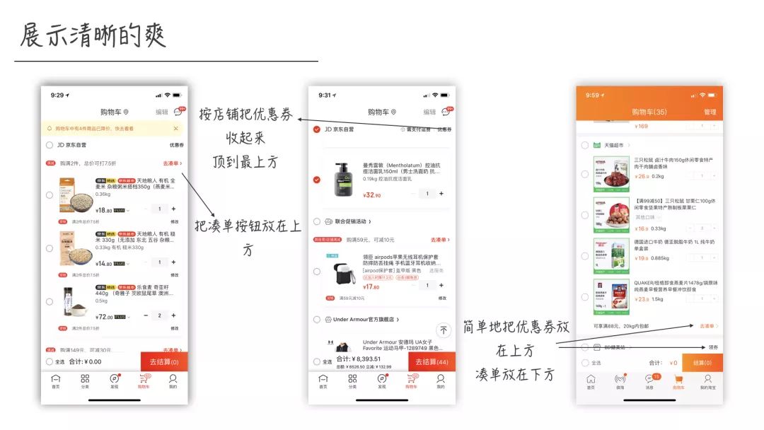 淘宝采用了一上一下的放置方法,我觉得其实蛮不方便的;而新版京东的交互让人感觉非常爽,不但用一个优惠券按钮搞定了所有商品,又可以把凑单的优先级提到很高,给人一种很爽的择物体验。