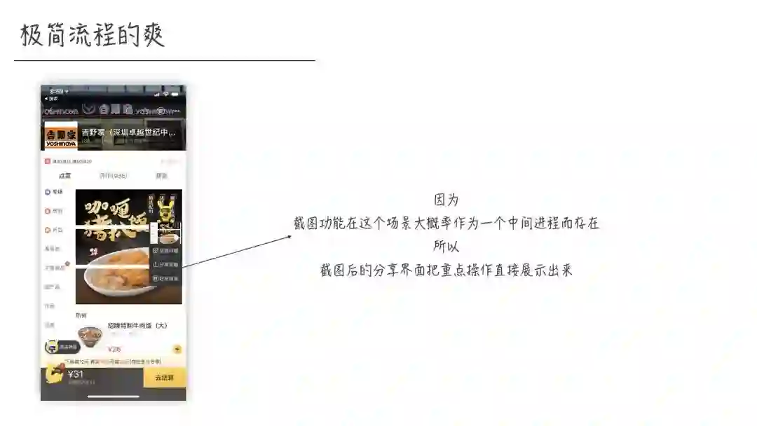 比如截图分享功能,明知道用户截图是为了分享的情况下,那么快速的弹出一个分享按钮也是极简交互的选择,可以节省用户的操作步骤,把爽感做到极致。