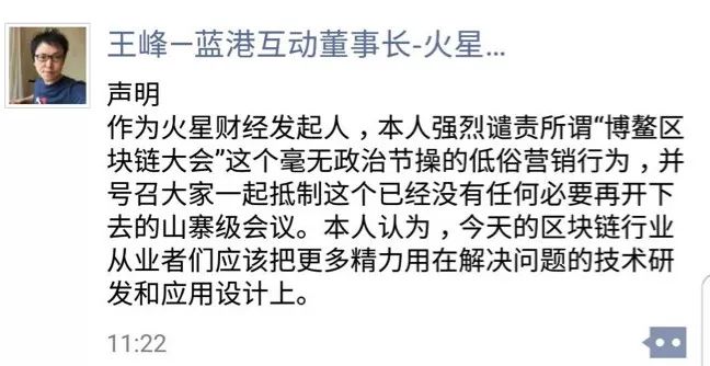 在现场多位链币圈创业者还在朋友圈转发了许国祥发表演讲的照片,并借机宣传自己的公司品牌。这种恶意炒作的行为,立刻遭到了业内的集体抨击。火星财经创始人王峰在朋友圈中直接指出这是一起毫无政治节操的的低俗营销行为,并号召抵制“已经没有任何必要再开下去的山寨级会议”。