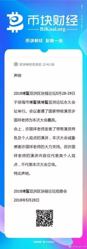 “许国祥老师发表了带有演员特色及个人观点的演讲,但许国祥老师的演讲内容仅代表其个人观点,不代表本次大会方的立场。”5月28日中午,2018年博鳌亚洲区块链论坛组委会在币块财经上发表了这样一则声明。