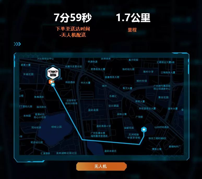 本次配送所用无人机是亿航智能研发的四旋翼物流无人机,飞行速度可达40km/h,配送能力半径约4.5km,载重500g。后续亿航智能将迭代载重5kg,配送能力半径7km以上的物流无人机,以满足超级物种全品项的配送需求和更大的用户覆盖范围。