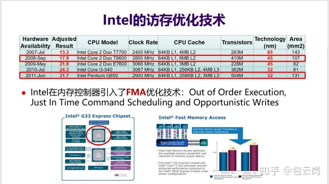 17. Intel 在访存优化上很下功夫,可以通过对比两款 Intel CPU 来一窥究竟。Core 2 Due T9600 和 Pentium G850 两块 CPU,工艺差一代,但频率相近,分别是 2.8GHz 和 2.9GHz,但性能差了 77%——SPEC CPU 分值 G850 是 31.7 分,而 T9600 只有 17.9 分。