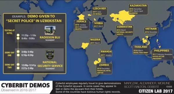在这些网络文件夹中,Citizen Lab 团队发现了他们需要了解的一切,包括含有攻击者 IP 地址的日志,以及埃塞俄比亚政府试图感染和监视的详细目标。值得注意的是,通过分析网络间谍活动的指挥和控制服务器,Citizen Lab 团队还监控到 Cyberbit 员工在感染笔记本电脑的情况下访问这些服务器,显然是向潜在客户展示 Cyberbit 的产品。据统计,Cyberbit 的这些客户包括泰国皇家军队、乌兹别克斯坦国家安全局、赞比亚金融情报中心和菲律宾总统马拉坎南宫。