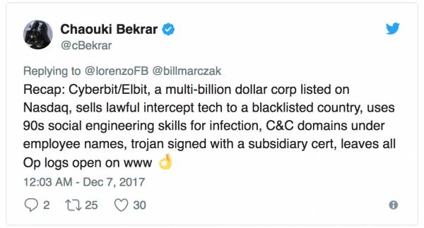 这些攻击中使用的恶意软件是一个名为 PC Surveillance System ( PSS ) 的 Windows 程序,由 Cyberbit 出售,并且 Cyberbit 有意将 PSS 作为合法的监控软件销售给全球的情报与执法机构。据悉,Cyberbit 是 Elbit Systems 的子公司,目前还有其他三家“安全”公司加入了 Elbit Systems,分别是 HackingTeam(产品:RCS – 远程控制系统),Gamma 集团(产品:FinSpy)和 NSO 集团(多个产品),这些公司的产品都是作为专制政权的首选网络工具。