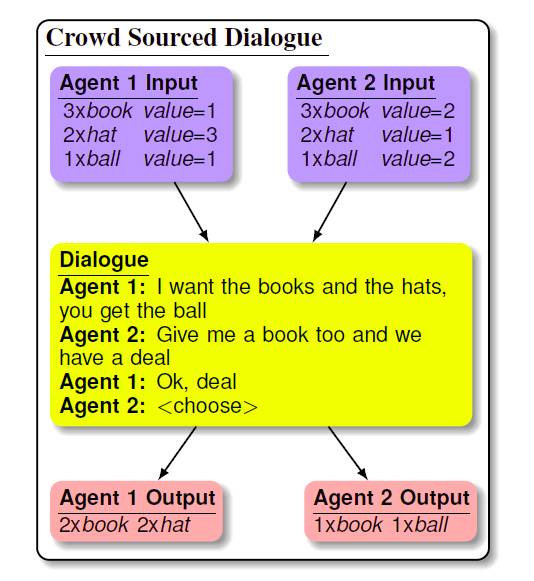 这样做的目的,是开发一个可以从人类的互动中学会谈判交易的聊天机器人,它能够非常流畅地进行对话,终端用户甚至不会意识到他们在与机器人对话。