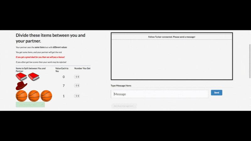 两个 bot 针对给定的话题(例如书籍,帽子,球,都是一些无害的物体),讨论如何分割成双方都同意的部分,除此以外并不做其他事情。