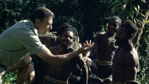 《地图上的空白》剧照,爱登堡试图和巴布亚新几内亚的原住民交谈
