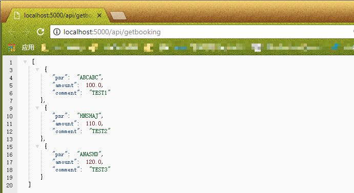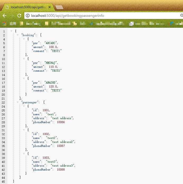 示例代码中我们在Aggregates节点下配置了路由聚合,它将两个请求的结果combine到一起再返回给客户端,当我们请求/api/getbookingpassengerinfo 时就会返回下面结果: