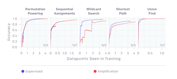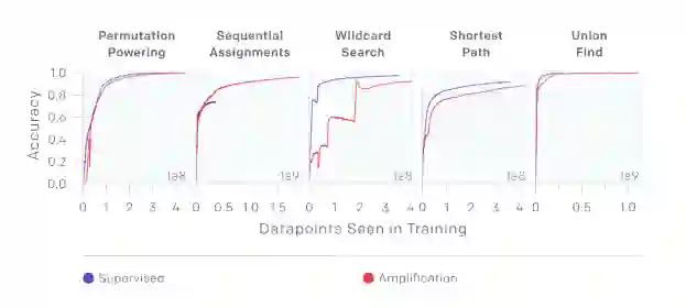 我们在五个不同的玩具算法任务中测试了这种方法,这些任务都有直接的算法解决方案,但我们假装不知道(例如,寻找图中两点之间的最短路线),不过,若想把每个片段手动组合起来就需要大量精力。我们使用迭代扩增来学习只使用片段作为训练信号的直接算法,从而模拟人类知道如何组合解决方法片段、但没有直接的训练信号的情况。
