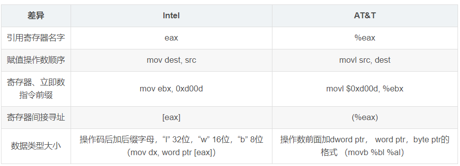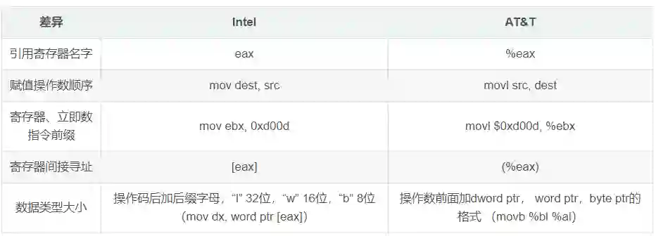 AT&T的汇编语法格式和Intel汇编语法格式的是不同的