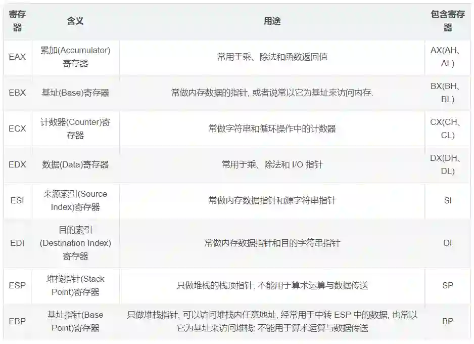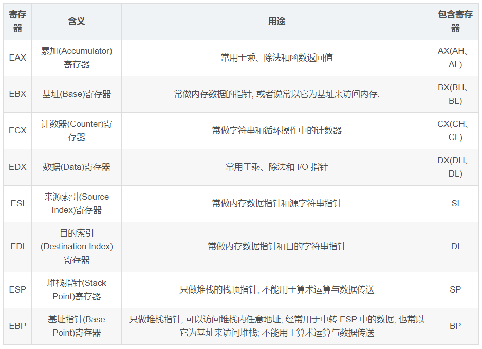 上面提到大8个寄存器都有其特定的用途,我们以32位 CPU 为例简单说明下这些寄存器的作用,整理如下表: