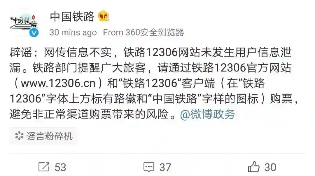 “辟谣:网传信息不实,铁路12306网站未发生用户信息泄漏。铁路部门提醒广大旅客,请通过铁路12306官方网站(www.12306.cn)和“铁路12306”客户端(在“铁路12306”字体上方标有路徽和“中国铁路”字样的图标)购票,避免非正常渠道购票带来的风险。”
