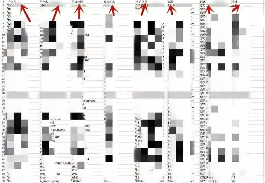 这份数据涉及的个人信息,不仅私密并且超级重要:ID、手机号、密码、姓名、身份证、邮箱、问题及答案等,都包含在里面。而安全问题,可用于通过申诉来获取其它平台账户的信息。