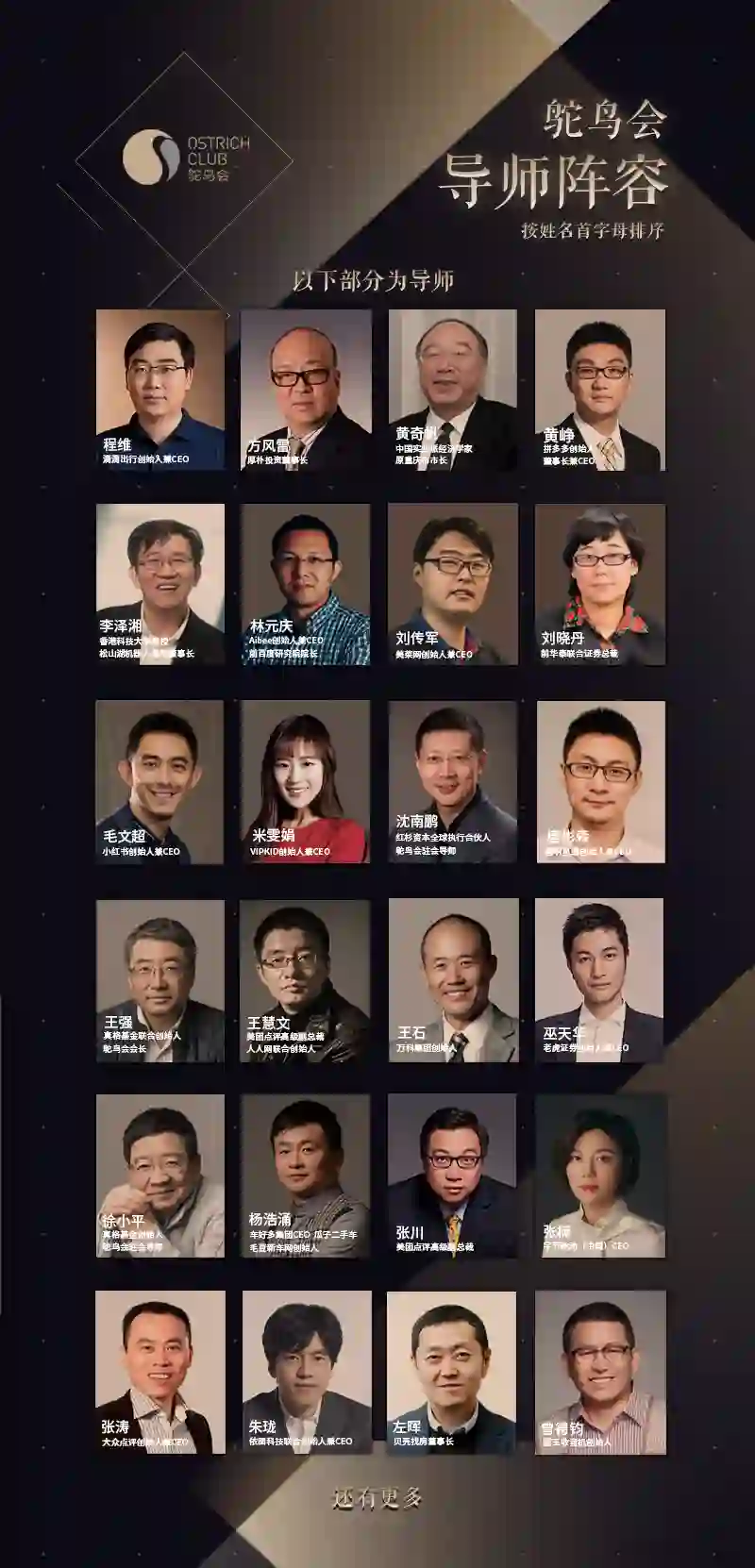 在王强、沈南鹏、徐小平三位驻会导师的带领下,鸵鸟会导师团由
