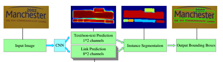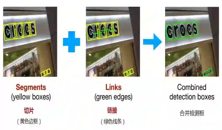 尽管 CTPN 文本检测方法能够在自然场景下较好的实现对文字的检测,但在处理非水平文本时,该算法则表现出了不太理想的效果。SegLink 正是为了解决这一问题而生出的算法,它可以实现对各种角度文字的灵活检测。