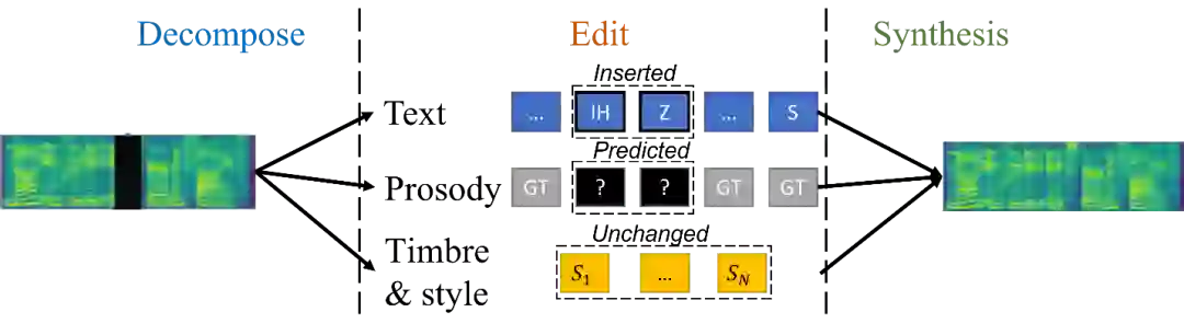 不同于已有方法中将语音插入任务视为文本-语音模态融合的思路 [3,5],如图2所示,研究员们将语音先解耦成文本、韵律(音素序列的音高、音量、时长)、音色、风格四个要素,再在每个要素上进行可控的编辑操作,最后将四部分合成为插入后的语音。一言以蔽之,即“先解耦再编辑”。