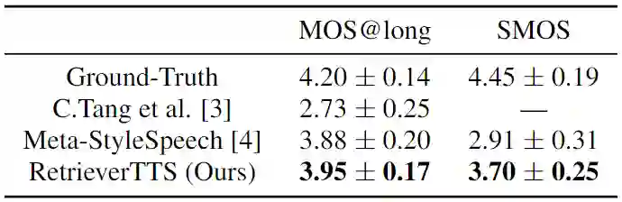 在表3中,研究员们与其他方法进行了对比,发现基于模态融合的方法[3]在插入较长语音的情形下语音自然度表现较差,而其他的零样本说话人自适应语音合成(zero-shot speaker adaptive TTS)[4] 在音色相似度方面与 RetrieverTTS 的方法有较大差距。上述对比体现出了 RetrieverTTS 方法的优越性。