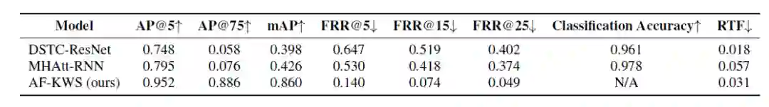 研究员们选用了两个先进的关键词检测模型[10][11]做对比,在连续语音关键词检测的实验设定中,AF-KWS 的模型在可比的运行速度下,平均准确率远超其他模型。