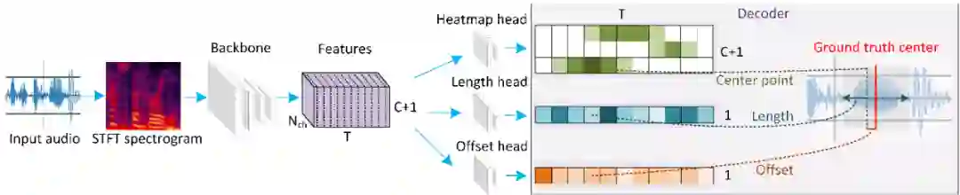 如图4所示,对于输入语音,研究员们首先提取了语音的 STFT 频谱图,然后使用 ResNet[9] 进一步提取特征,然后将特征输入三个预测模块,分别用于预测关键词的热力图、关键词的长度和关键词位置偏置。在训练阶段,热力图以关键词的位置为中心,使用高斯核函数将关键词的位置扩展。在预测阶段,研究员们取预测得到的热力图的峰值点作为预测得到的关键词的位置,然后提取对应位置的关键词长度和偏置的预测结果,计算得到最终的关键词的位置和类别。