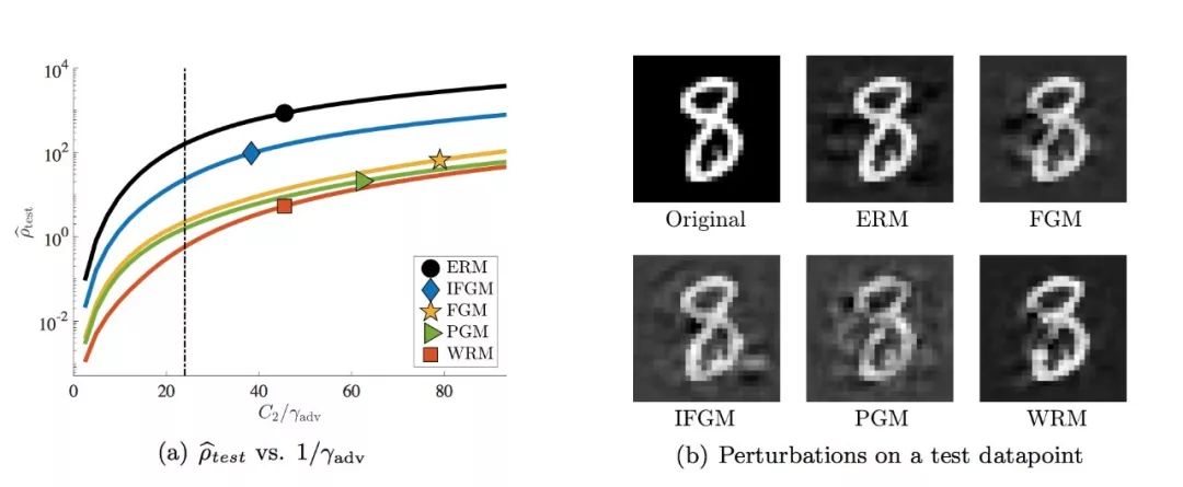 图 4. 损失函数表面的稳定性。在(a)中,我们显示了给定 γadv 的扰动分布 ρbtest 的平均距离,这是对于决策表面的输入的局部稳定性指标。(a)中的垂直虚线表示我们用于训练 WRM 的 γ。在(b)中,我们将最小的 WRM 扰动(最大 γadv)可视化,以使模型对数据点进行错误分类。更多的例子见附录 A.2。