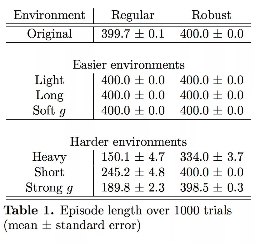 表 1. 1000 次实验后的 Episode 长度(平均数 ± 标准差)