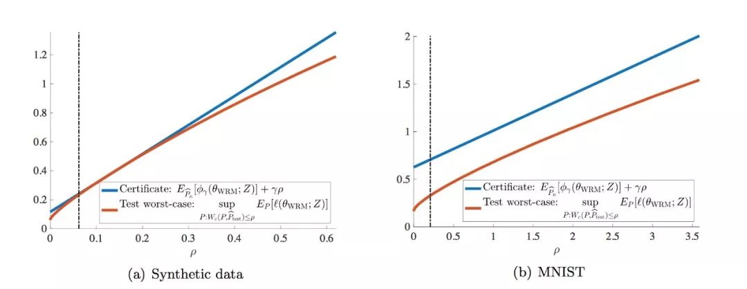 图 2. 用合成数据(a)和 MNIST(b)进行实验的鲁棒性保证(11)(蓝色)和样本外(out-of-sample/测试)最差情况下的性能(红色)之间的经验性比较。在(11)中省略了统计误差项 ǫn(t)。垂直虚线表示在训练集 ρbn(θWRM)上达到的鲁棒性水平。